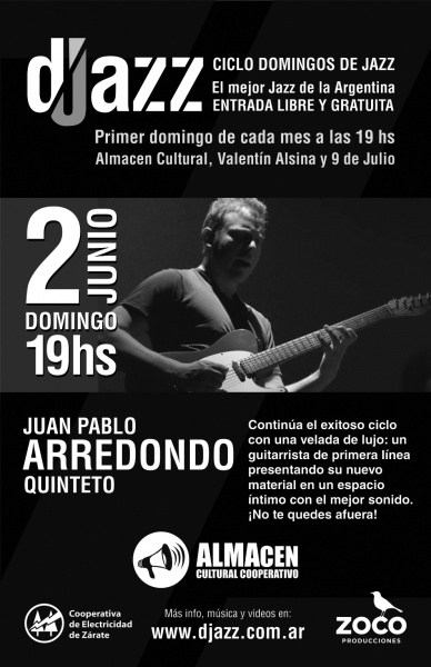 Domingo 2 – 19 hs. // Ciclo de Jazz dJazz 2013, presenta a JUAN PABLO ARREDONDO Quinteto. Nuevo combo de este singular guitarrista. Lo acompañan Lucas Goicochea en saxo alto; Mauricio Dawid, en contrabajo; Pablo Díaz, en batería y percusión; Damián Allegretti, en batería y percusión. El mejor jazz de Argentina viene a Zárate. GRATIS…