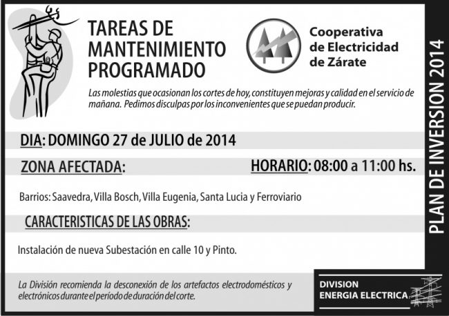 Este domingo, se instalará una nueva Subestación en Pinto y Calle 10, por lo cual se verá afectado el suministro en parte de zona Sur de la ciudad.