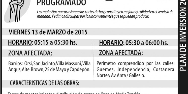 La División Energía Eléctrica informa que se llevarán a cabo tareas de mantenimiento y distribución de cargas sobre Línea de Media Tensión, razón por la cual los asociados y usuarios cuyos domicilios se encuentran ubicados en los barrios ORSI, SAN JACINTO, VILLA MASSONI, VILLA ANGUS, ALTE. BROWN, 25 DE MAYO y CAPDEPON el día VIERNES 13 de MARZO de 2015, se verán afectados por un corte de energía eléctrica entre las 05:15 y las 05:30 hs.