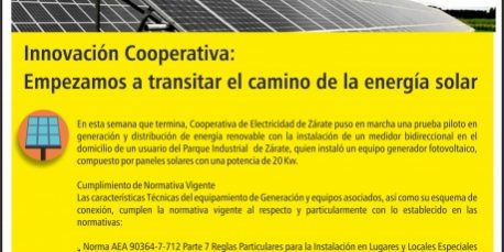 Cooperativa de Electricidad de Zárate puso en marcha una prueba piloto en generación y distribución de energía renovable con la instalación de un medidor bidireccional en el domicilio de un usuario del Parque Industrial de Zárate, quien instaló un equipo generador fotovoltaico, compuesto por paneles solares con una potencia de 20 Kw.